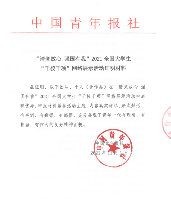 2021年11月9日,由中国青年报·中青在线开展的“请党放心 强国有我”2021全国大学生“千校千项”网络展示活动评选结果正式公布。其中,我院共入选实践团队5支,再创佳绩!