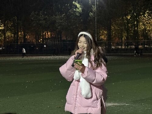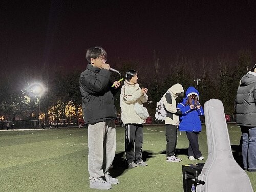 为保障活动顺利开展,梦想文艺社成员提前进入筹备状态,搭建简易舞台、调试音响设备,细致的筹备工作为活动成功奠定了基础。活动开场,随着吉他前奏轻响,演唱者率先带来《牧马城市》——略带沧桑的旋律刚起,便让不少路过的同学驻足围观。“把烦恼痛了吞了认了算了,不对别人讲”的歌词响起时,有观众轻轻跟着哼唱,当副歌旋律上扬,现场自发响起细碎的掌声,晚风里的氛围渐渐热了起来。紧接着,《美人鱼》的温柔旋律接档:舒缓的节奏裹着秋夜的凉意,演唱者轻柔的唱腔像“晚风裹着月光”,让原本喧闹的操场安静了几分。有些在草坪上的同学打开手机手电筒,随着旋律轻轻摇晃,星星点点的光与夜空的星子交叠,成了现场最温柔的布景。收尾曲《永不失联的爱》则直接将氛围拉满:细腻的唱腔里藏着柔软的情绪,“你是我这一辈子,都不想失联的爱”的副歌响起时,有观众举起手机记录画面,还有人跟着大声合唱,歌声裹着晚风飘向操场尽头。收尾的长音落下后,现场掌声与欢呼声响了半分钟,让演唱者也露出了腼腆的笑容。